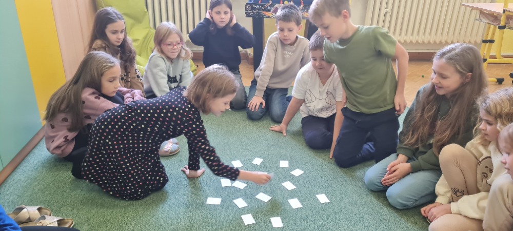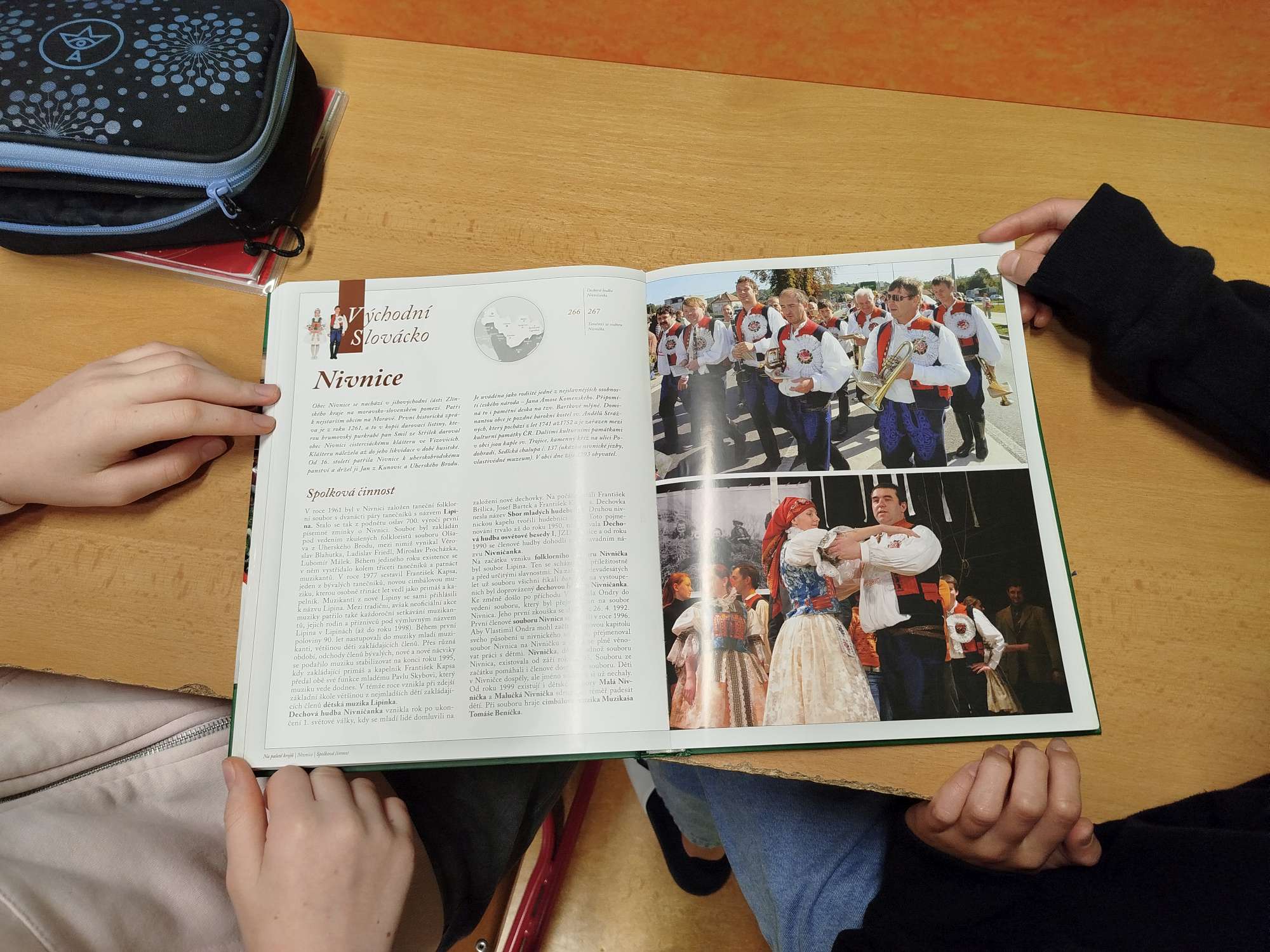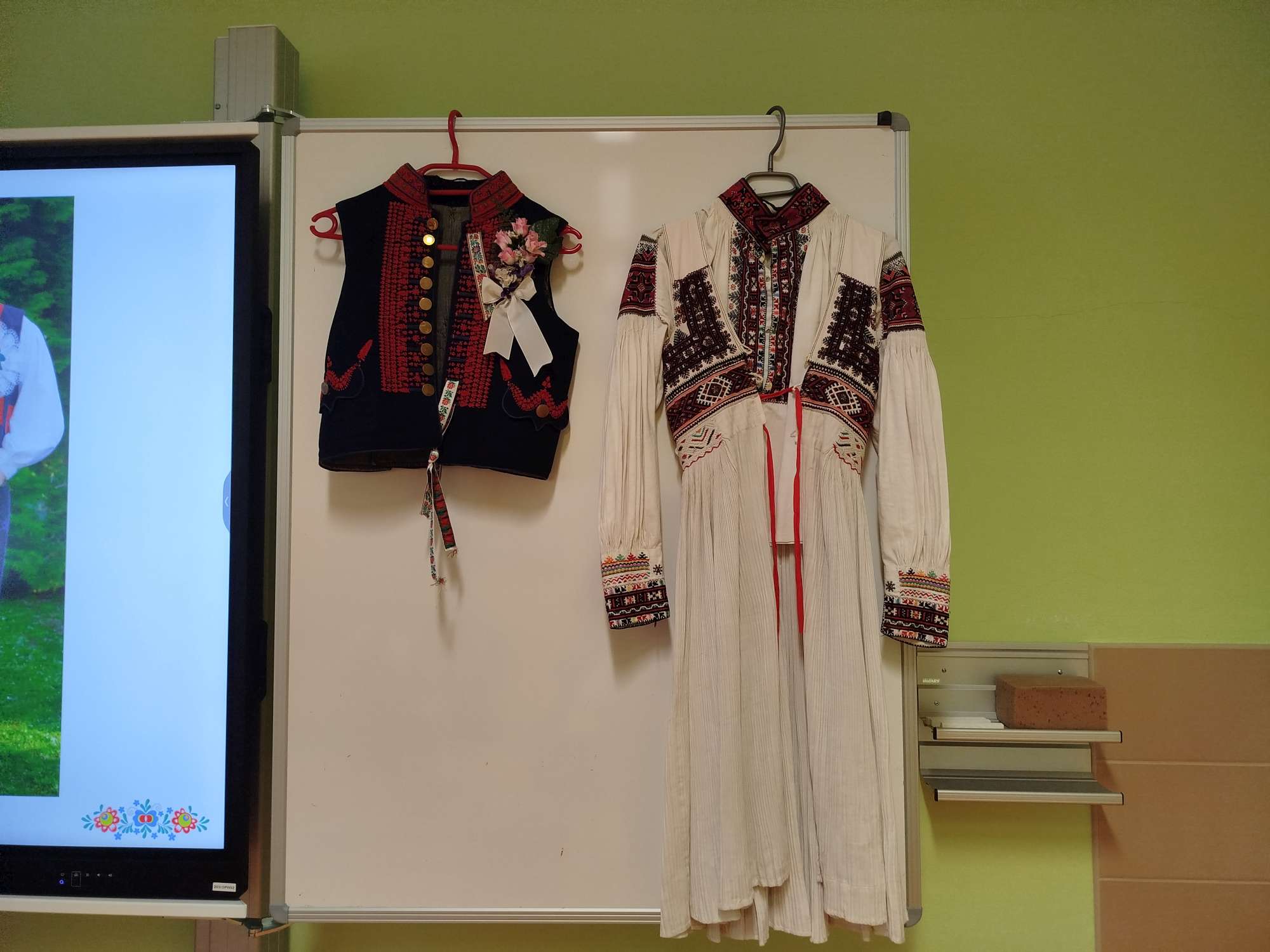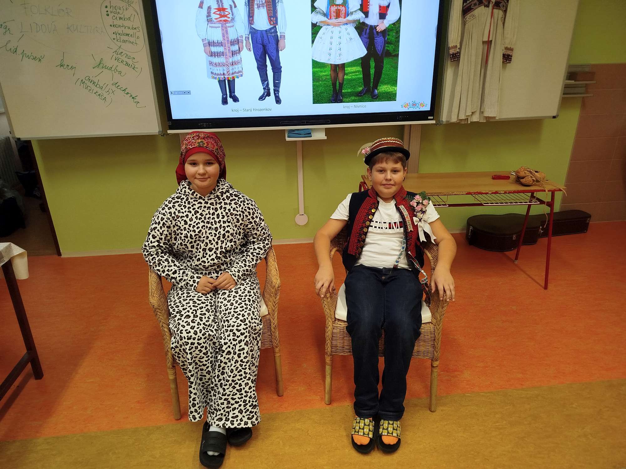 V úvodu jsme si poslechli ukázku cimbálové muziky a zhlédli ukázku verbuňku. Pomocí wordwallu jsme si vysvětlili rozdíl mezi lidovou a umělou písní, jaké hudební nástroje jsou typické pro cimbálovou a dechovou hudbu. Pro žáky byla nejvíce zajímavá ukázka jednotlivých částí ženského a mužského kroje. Chlapci si vyzkoušeli klobouk s kosárky a zdobenou kordulu, tzv. brunclek. Dívkám byl uvázán turecký šátek. Žáci si mohli prolistovat také v knize „Na paletě krojů“.