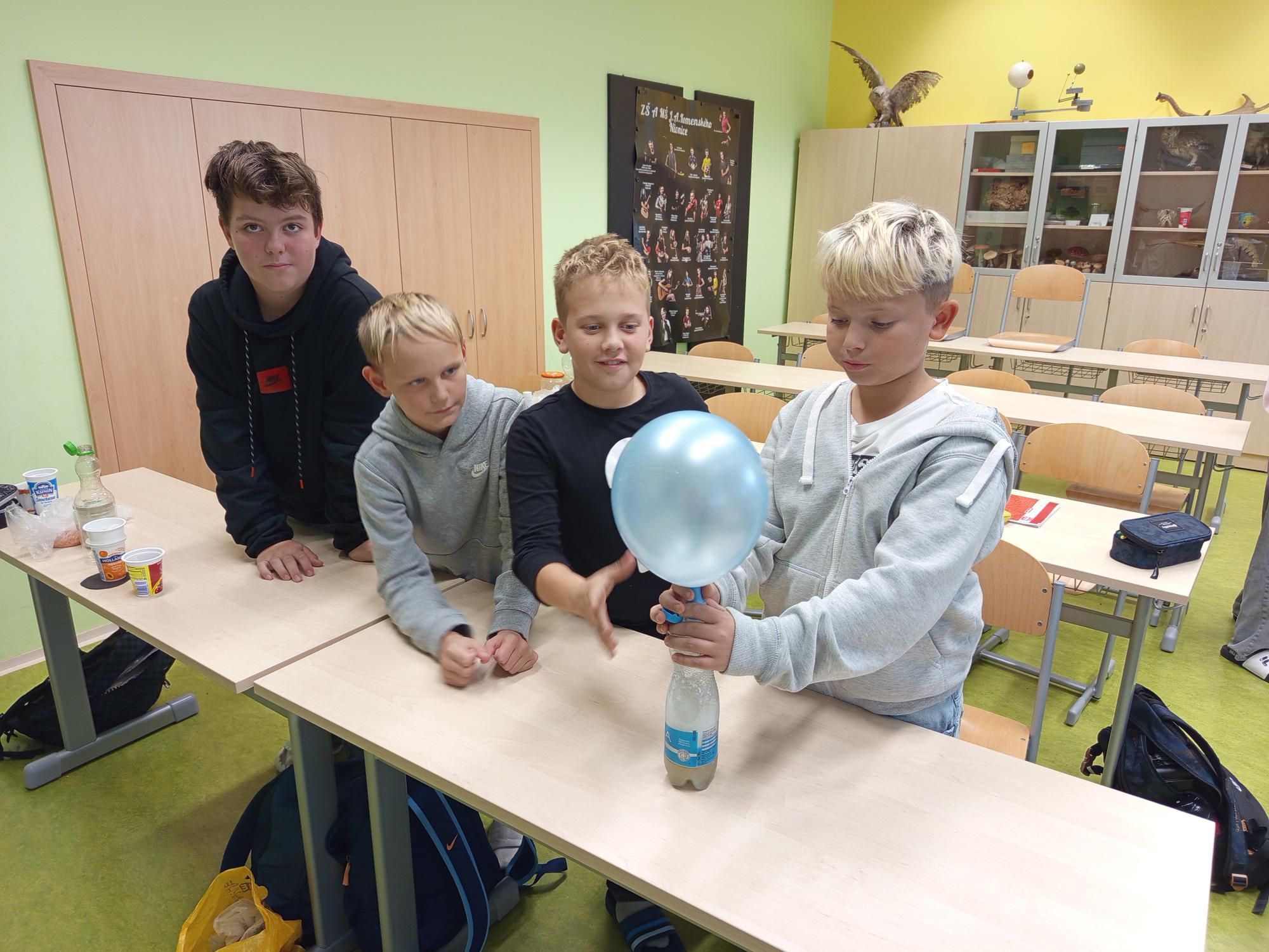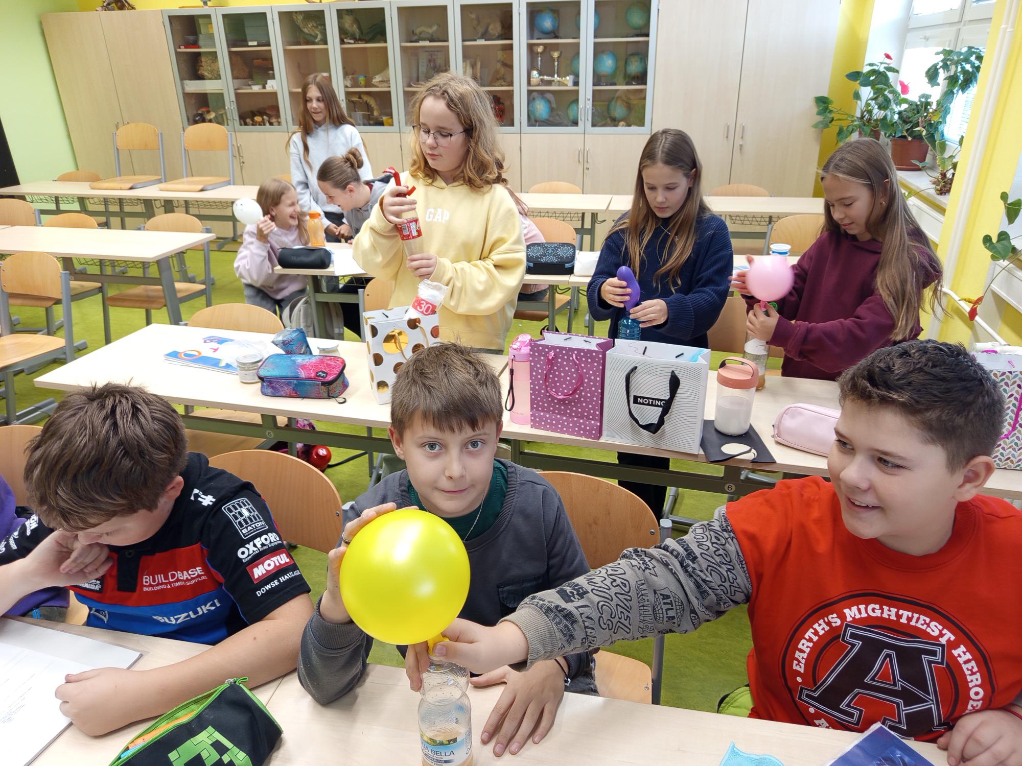 Naši šesťáci tvořili podmínky klíčení rostlin. Jejich badatelská činnost bude pokračovat v pozorování, zapisování, měření a vyvození závěru. Dále zjistili, jak narušit povrchové napětí tekutin a jak nafouknout balónek bez foukání.