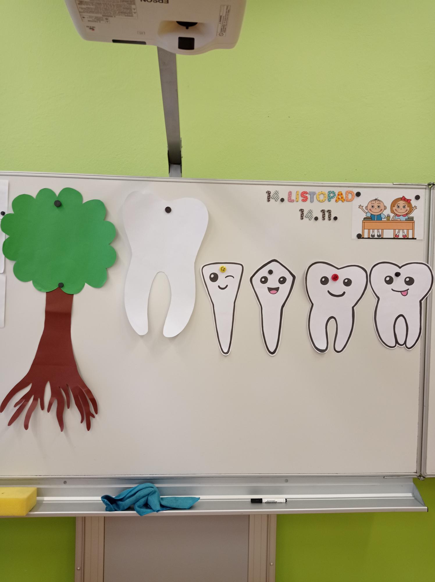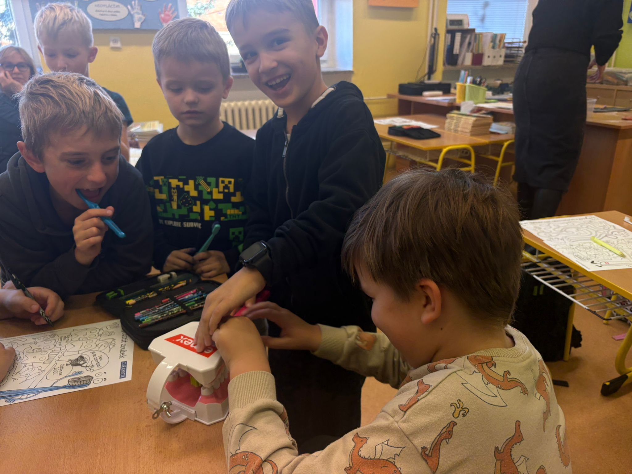 V pátek 14. listopadu první a druhé třídy navštívila dentistka, která hravou formou dětem ukázala, jak si mají správně čistit zuby. Žákům také vysvětlila, proč je důležité si je pravidelně čistit. Děti si mohly všechno vyzkoušet přímo na sobě nebo na modelu chrupu. Dětem se beseda líbila a slíbily, že si budou zoubky čistit správně a pravidelně. 😁
